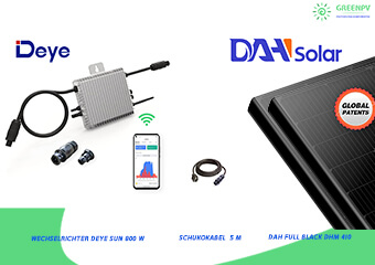 Balkonkraftwerk Set 820: 2 Module DAH Full Black DHM 410, Wechselrichter DEYE sun 800 W, Schuko-Anschlusskabel 5 m,  Gratis-App Solarman